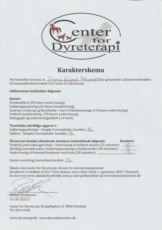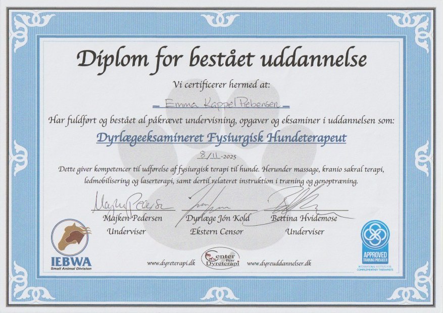 Jeg er certificeret hundeadfærdsinstruktør og dyrelægeeksamineret fysiurgisk hundeterapeut- uddannet ved Center For Dyreterapi i Hirtshals. Center for dyreterapi er den eneste sted i landet med internationale godkendelser fra PETbc, IICT og IEBWA.